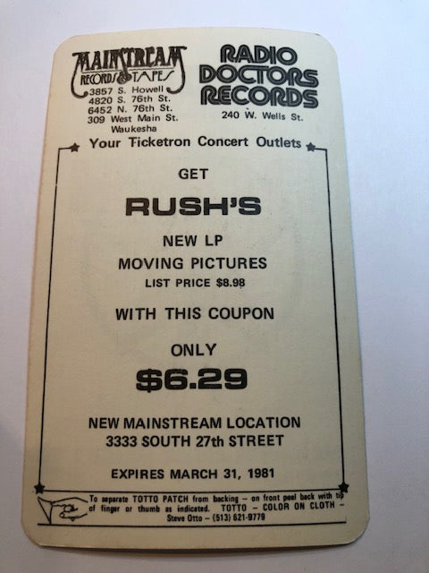 Selling The Collectors CollectionVintage 5" tall 1981 Rush Moving Pictures Tour cloth OTTO Backstage Pass. Excellent unused condition. This was a promo pass that was given away by ...