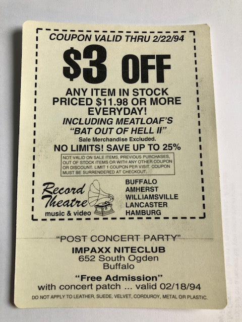 $25.00| /Meat Loaf - Bat Out of Hell Tour 1994 - Shea Theatre - Backstage Pass